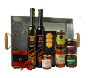 Everything you need to serve and present a delicious assortment of snacks and appetizers. Our signature Bread Dipping items (Roasted Garlic Olive Oil, Balsamic vinegar, and Herbs for Bread Dip) are wrapped together with savoury crackers and open and serve spreads. Everything is beautifully wrapped in a handy metal serving tray measuring 17″ x 12″ x 2″ high.