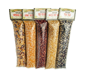 The Giant Butterfly Popcorn is second from the left in the photo. The unpopped kernel is a rich and vibrant yellow. As a result of popping, these butterfly kernels are an irregular shape with fragile protruding wings. In addition, it is a light, tender, and fluffy variety. This style of kernel is often found in movie theatres, stadiums, and carnivals!