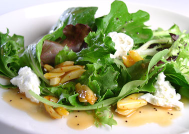 1. To prepare the salad, place the greens in a large bowl. Crumble the goat cheese over the top. Spread the candied almonds over the top. Toss the dressing throughout the greens and serve immediately.